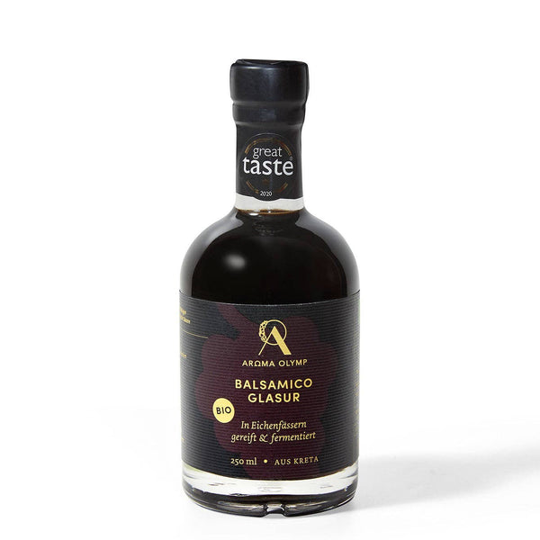 Geduld ist bekanntlich eine griechische Tugend. Denn warum soll man sich hetzen, wenn die Zeit alles besser macht? Sigá sigá, wie man in Griechenland gerne zu sagen pflegt. Aus diesem Grund reift unsere Balsamico Glasur drei Jahre in Eichenfässern. Anschließend wird sie in einem eigens entwickelten Verfahren weiter fermentiert, sodass sich ein perfektes und einzigartiges Geschmacksmuster entwickeln kann, vergleichbar mit 20-jährigem Balsamico.