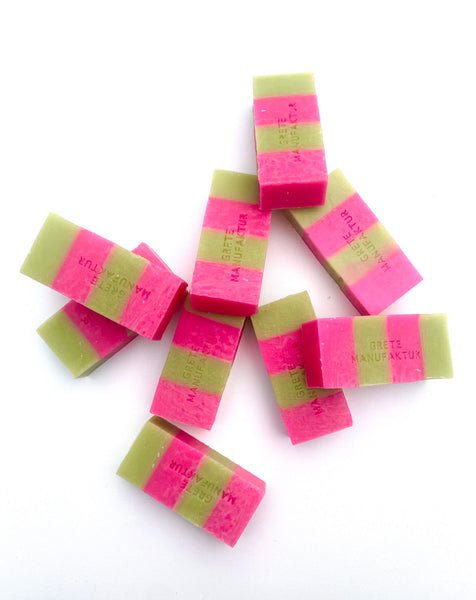 Die gestreifte Hedi Seife überzeugt mit einem frischen und lieblichen Duft und den knalligen Streifen.