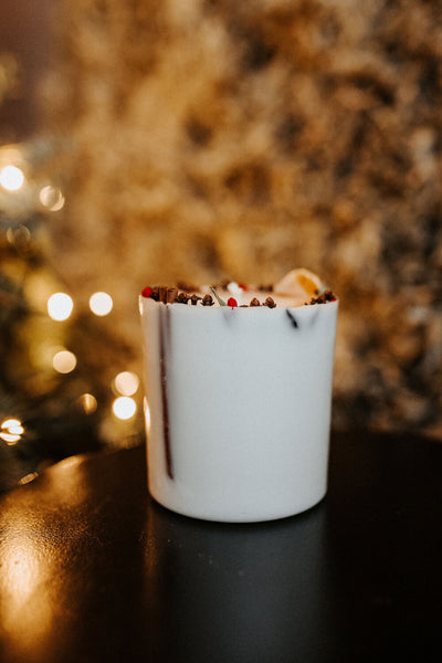 Duftkerze FEST ist aus natürlichem Rapswachs hergestellt und mit ätherischen Zimt- und Orangenölen angereichert. Beim Kerzenguss werden rote Paprika, Eukalyptusblätter, Anisstern, Nelken, Orangenscheiben, Zimtstangen hinzugefügt.