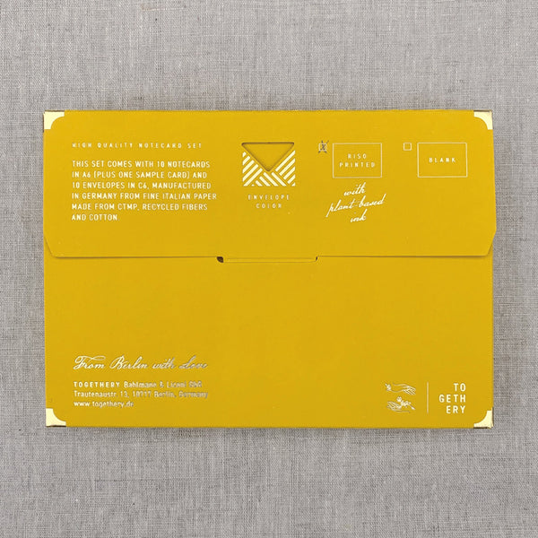 Briefkarten sind eine schöne Möglichkeit Danke zu sagen oder einen kurzen Gruß zu verfassen. Jede Karte dieses Sets ist mit dem gleichen Risodruck versehen. Gedruckt in Berlin mit pflanzenbasierter Tinte auf handverlesenem Naturpapier.